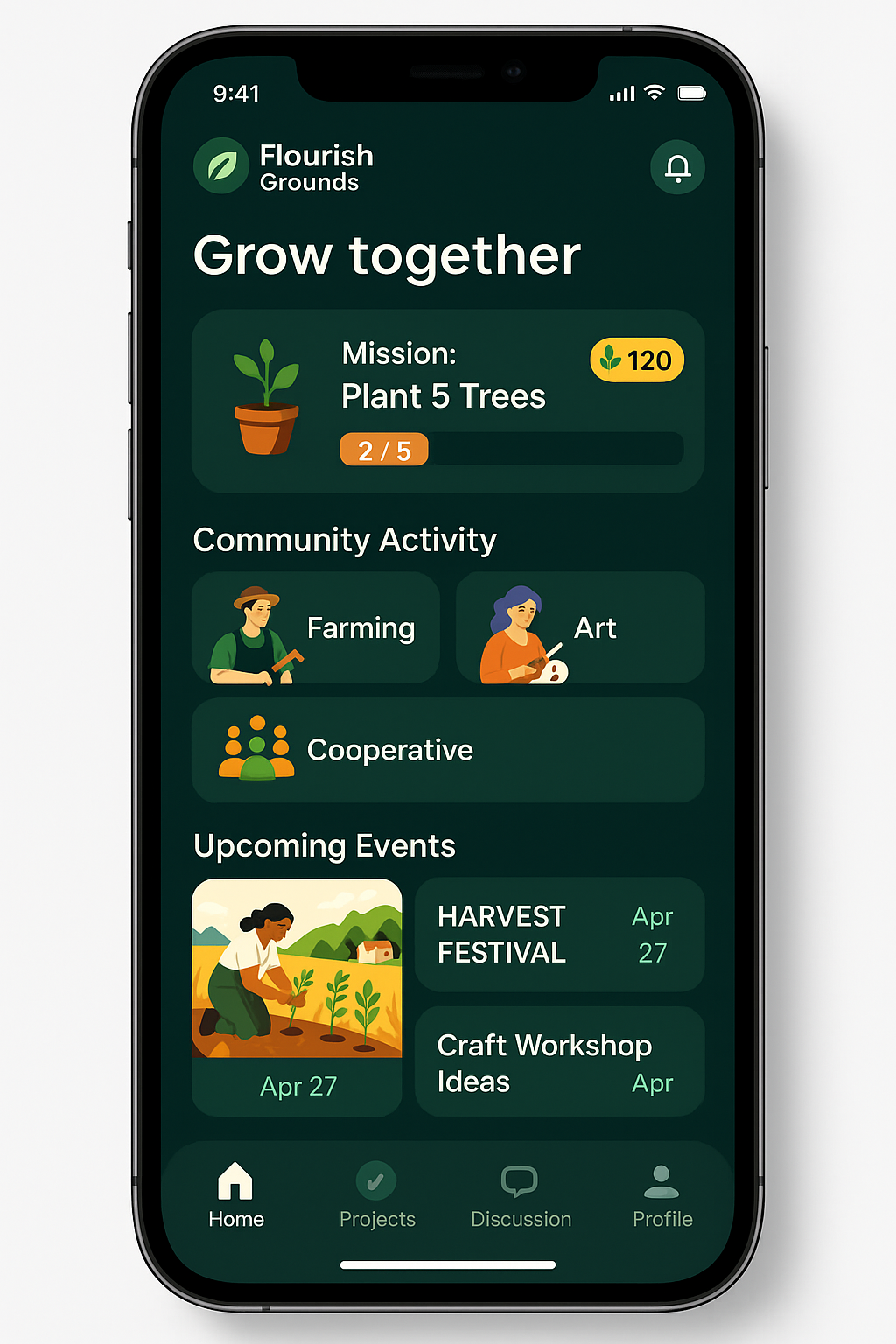 The goal of the Flourish Grounds mobile app is to create an inclusive, engaging, and sustainable platform that empowers individuals of all ages and backgrounds to take part in the revival of rural communities. The app would facilitate smooth communication, coordination, and growth within the community, offering a variety of tools and features to support the collective goals of living, farming, art, and cooperative life.